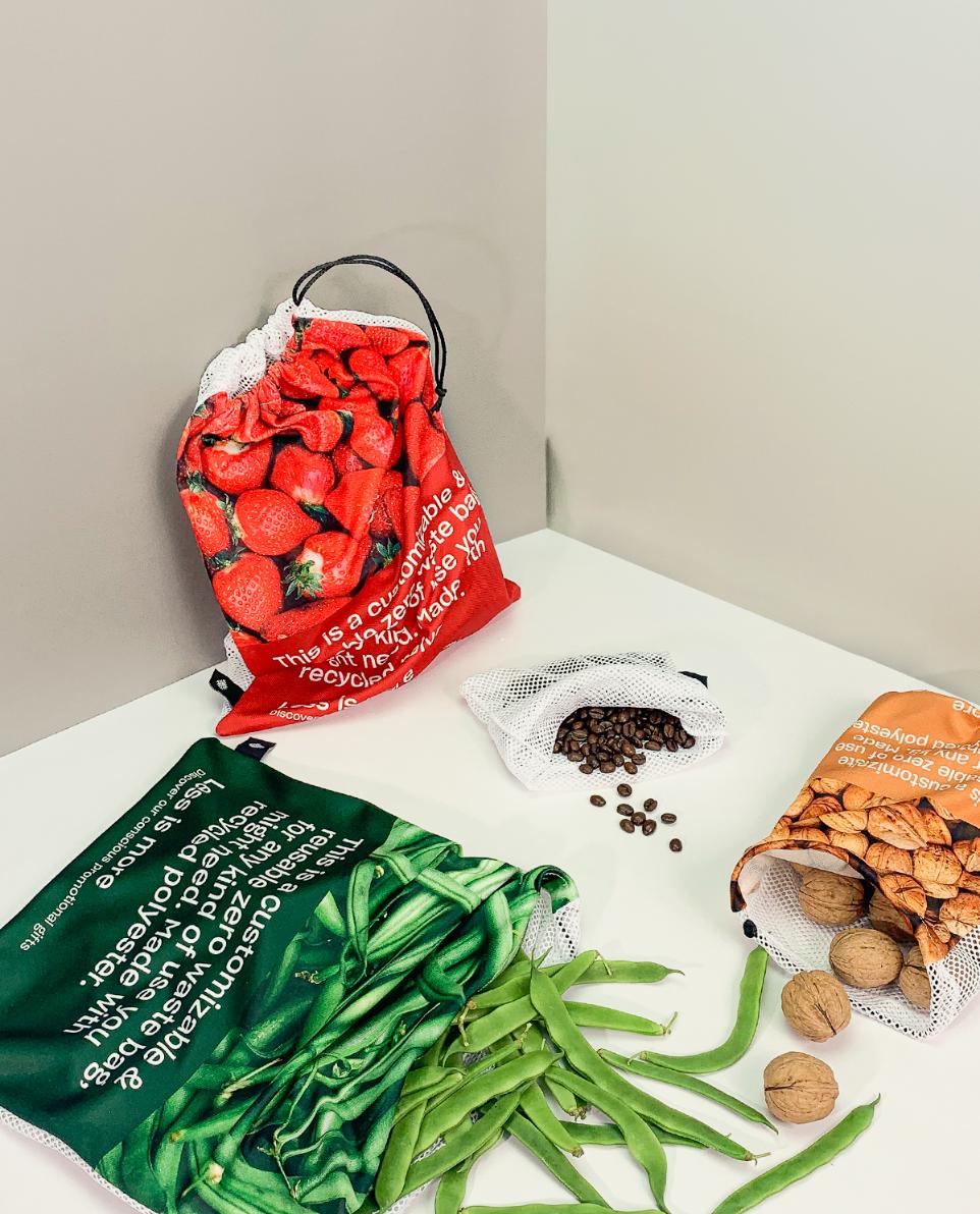 un pack de 4 bolsas reutilizables hechas con material reciclado.